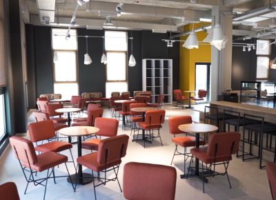 Modern cafeteria with various food and drink options
